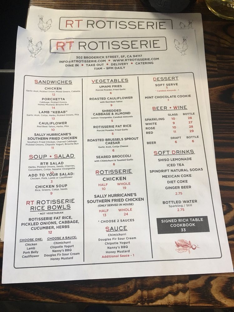 RT Rotisserie, located in San Francisco, offers a delightful menu of sandwiches, salads, and desserts. The restaurant provides a range of utilities including delivery, takeout, and reservations. With a focus on accessibility and sustainability, RT Rotisserie offers vegan options, compostable containers, and plastic-free packaging. Customers praise the delicious roasted chicken with crispy skin and succulent meat, paired with flavorful sauces and sides. The Rotisserie Chicken Rice Bowl with Chimichurri is a standout dish, featuring tender chicken, chicken fat rice, fresh veggies, and pickled onions. The Brussel Sprouts with garlic aioli and cheese receive high marks for their deep roasted flavor and perfect texture. Pricing is reasonable, making it an excellent value for a satisfying meal. The casual yet clean atmosphere and friendly service make dining at RT Rotisserie a pleasant experience. Be sure to try their other items and sauces, and don't miss out on the umami fries and seasonal specials.